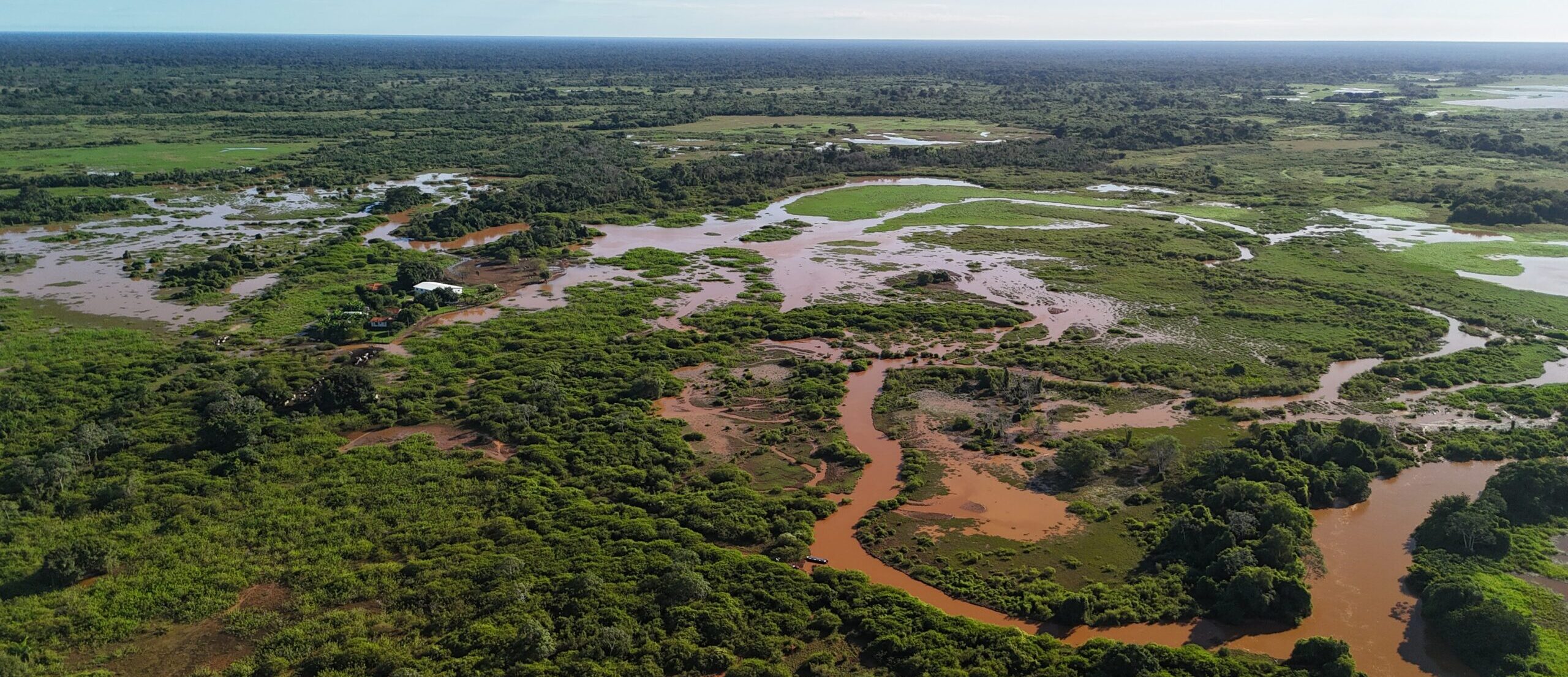 Planície alagável vista do alto, onde os cursos d’água sinuosos desenham a paisagem e sustentam uma rica biodiversidade no coração do Pantanal. A dinâmica das cheias molda o território, cria refúgios naturais e garante alimento para inúmeras espécies, reforçando a importância da conservação desse ecossistema único. 📷 Foto: Acervo Onçafari