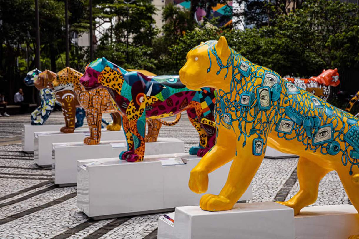 Como exemplo, a Jaguar Parade é uma exposição urbana que transforma arte em conservação. Cada escultura chama a atenção para a importância da onça-pintada, espécie-chave para o equilíbrio dos ecossistemas, e ajuda a sensibilizar o público sobre a proteção da fauna e dos habitats naturais. Foto: Jaguar Parade.